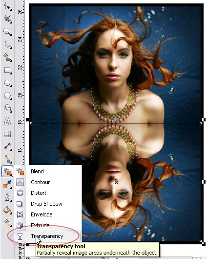 Selanjutnya seleksi pada objek foto hasil duplikasi dan pada Toolbox pilih Transparency tool;